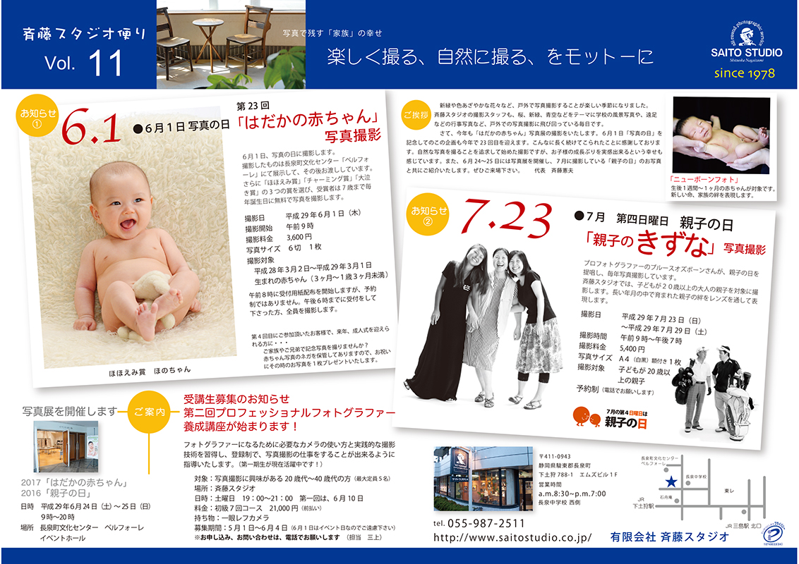 春発行するものは、6月1日「赤ちゃん写真」と7月第四日曜日「親子の日」のイベント紹介のためのチラシなので、毎年のものと変わり映えがしませんが、いつもの定番というのも斉藤スタジオらしくていいのかなと思っています。