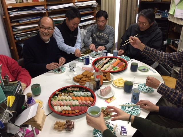 スタッフみんなで大掃除を済ませた後は寿司ランチ。毎年恒例の風景です。