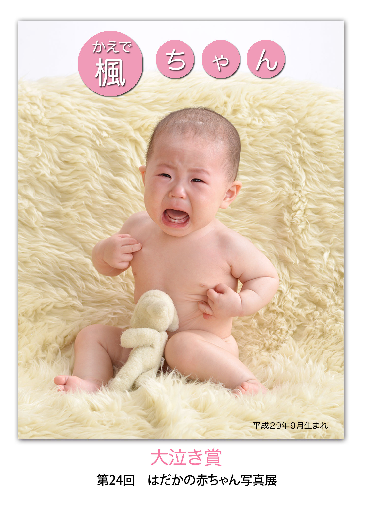 その中から「ほほえみ賞」「チャーミング賞」「大泣き賞」の3つの賞を選び、受賞者は7歳まで毎年誕生日に無料で写真を撮影させていただいています。